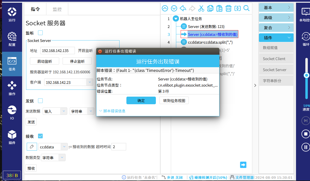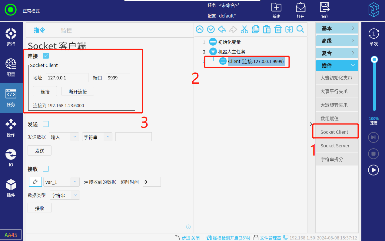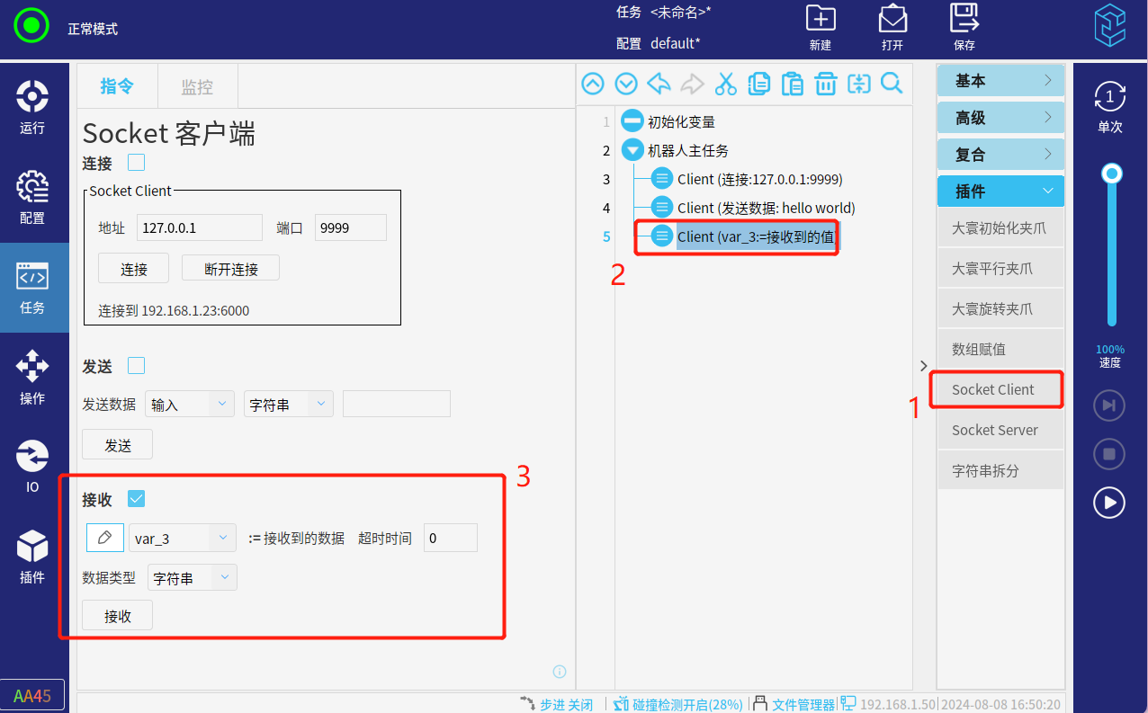 選擇導航欄“任務”-指令欄選擇“插件”-點擊"Socket Client"-設置該指令(勾選“接收”-輸入對應的數據類型)可以手動點擊”接收“,也可以直接”運行任務“來接收