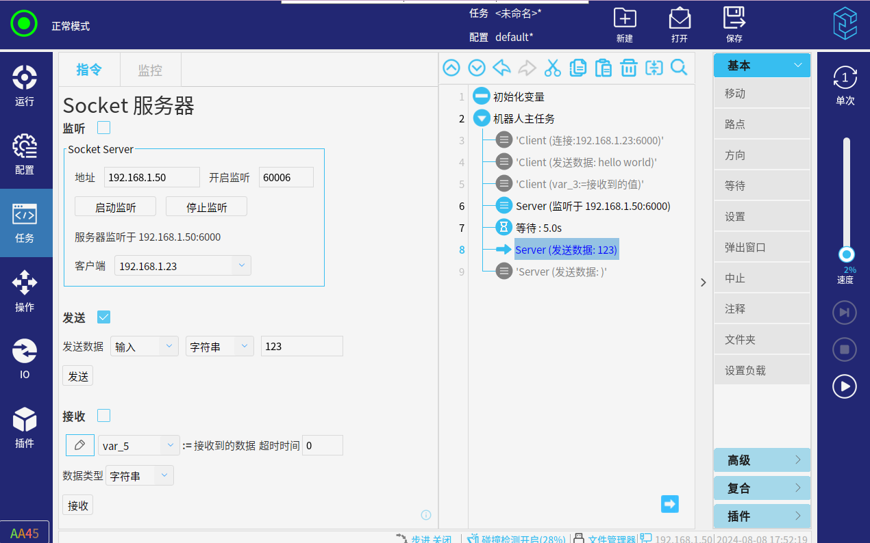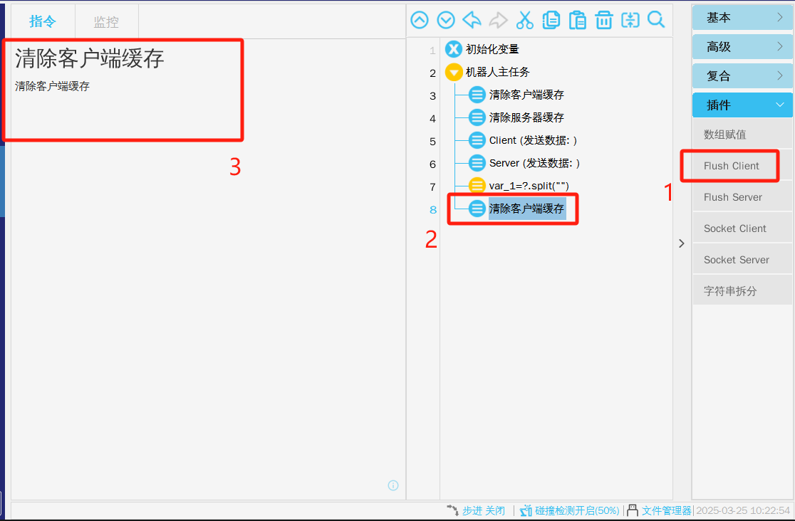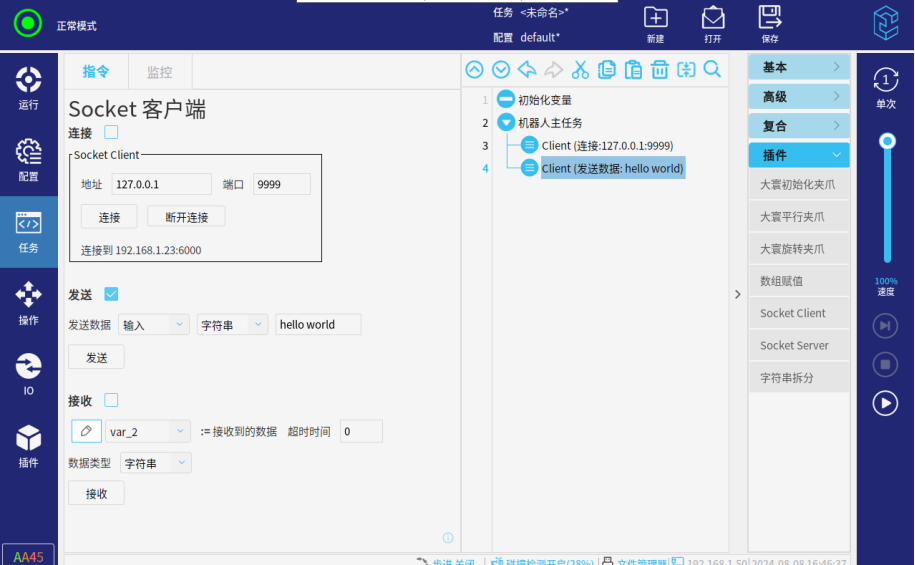 選擇導航欄“任務”-指令欄選擇“插件”-點擊"Socket Client"-設置該指令(勾選“連接”-輸入對應的服務端地址,端口號,“運行”或點擊"連接"即可)