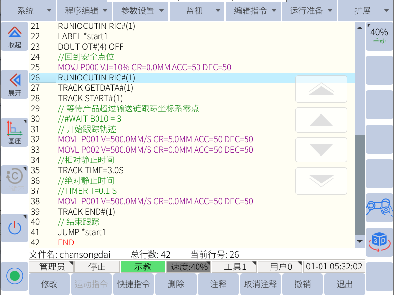 整體標定好后,運行JBI程序,將鑰匙旋鈕轉到PLAY模式,速度要放到100%,才能跟上傳送帶速度,然后上伺服,啟動。