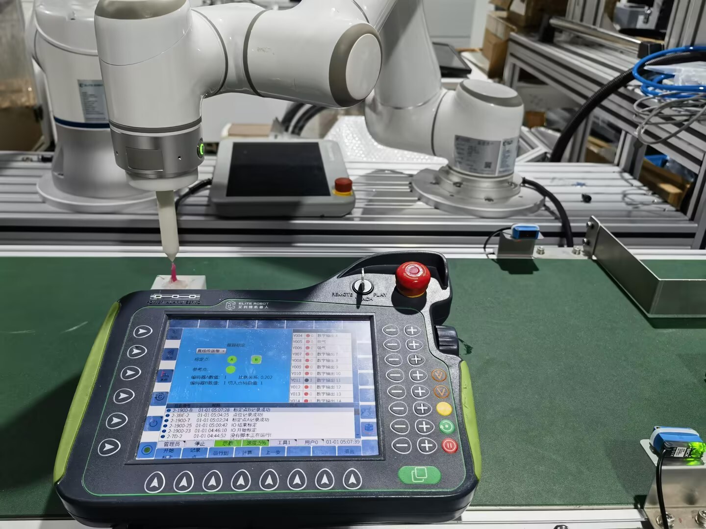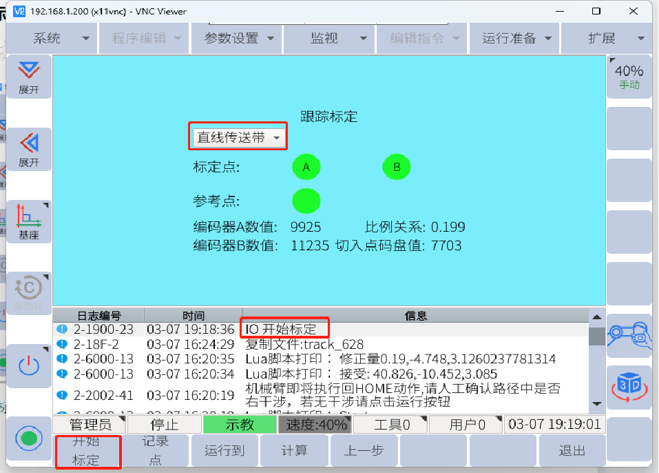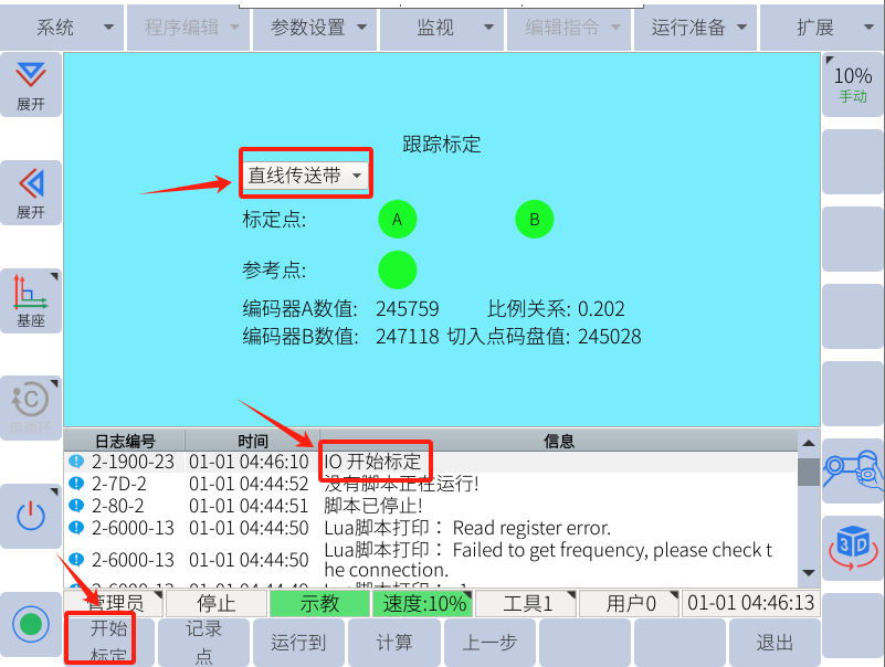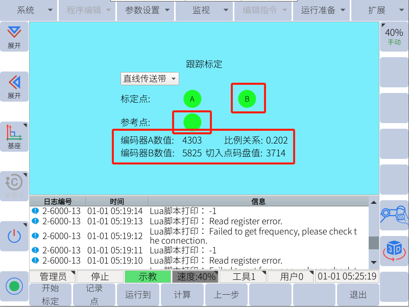 示教完跟蹤軌跡后將傳送帶緩慢開動一段距離后(設定的有效結束距離400mm以內,最優300-350mm),停止傳送帶運動(傳送帶速度保持不變),將機械臂移動至B點并記錄B點(A點B點需戳向同一個特征點記錄),記錄A點和B點時,下面會顯示編碼器數值,