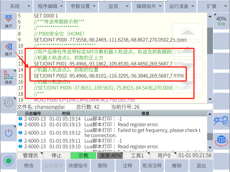 標定步驟:將物品放到傳送帶上緩慢開動傳送帶使物品經過傳感器(此時日志窗口顯示“io標定結束”)到達A點后,停止傳送帶運動,將機械臂移動尖點至A點并記錄A點和程序中的“P002”,此時可以退出標定頁面進入程序示教跟蹤軌跡(示教圖中應避免晃動物品)