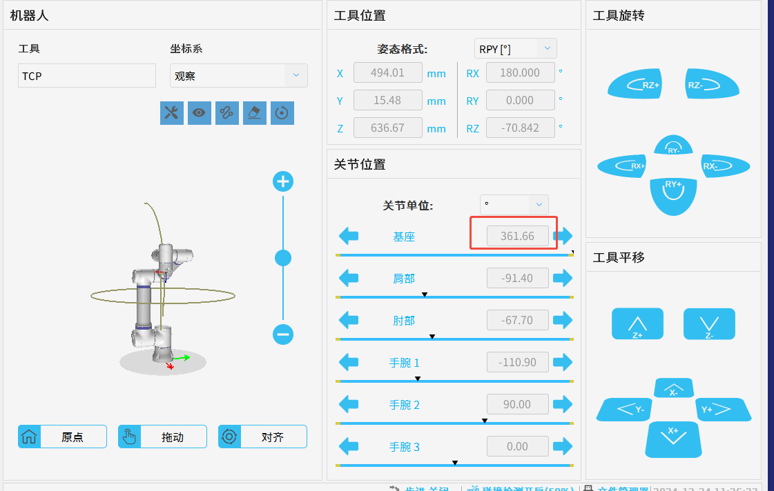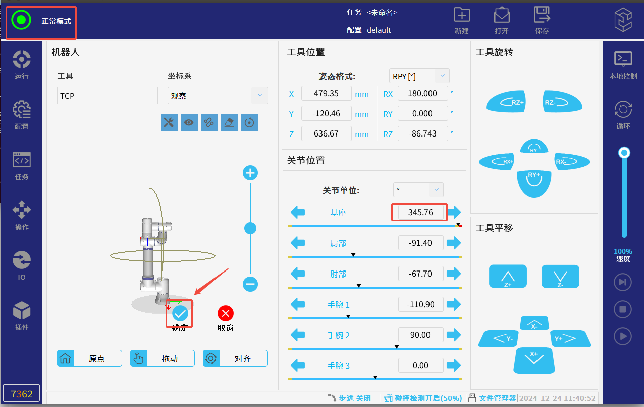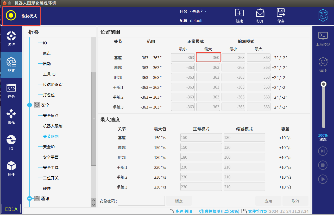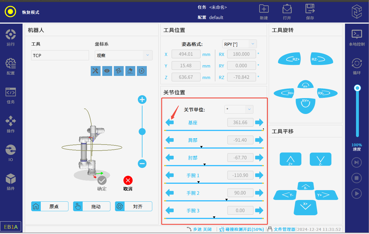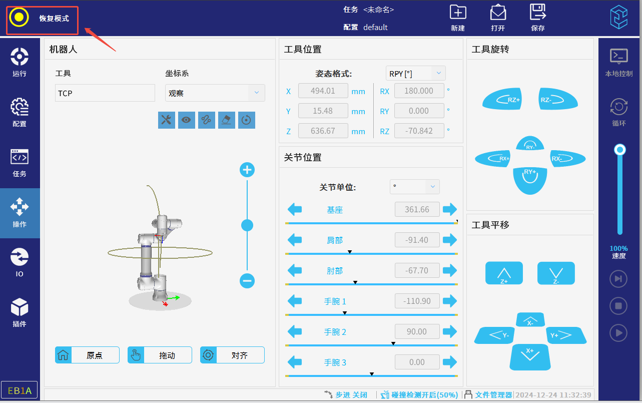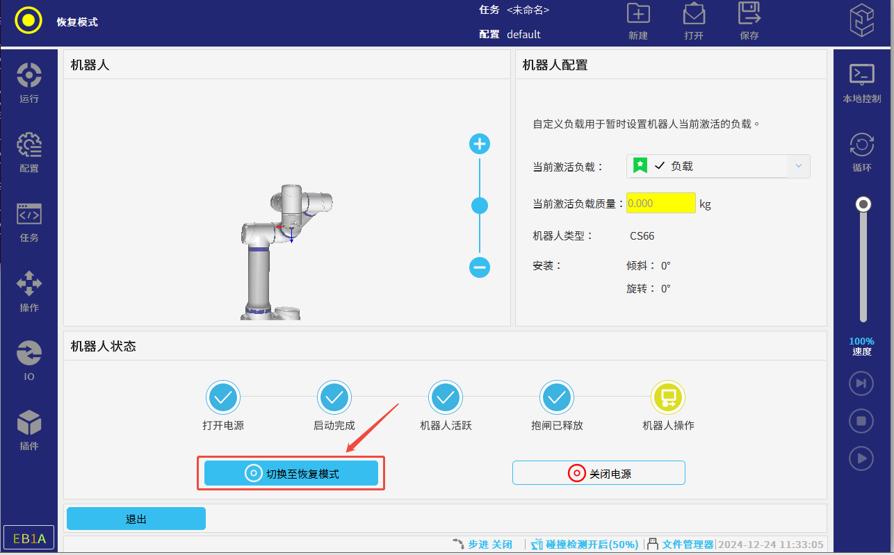 此時機器人的基座已經在關節限制內,左上角恢復正常模式,點擊確定按鈕即可退出恢復模式