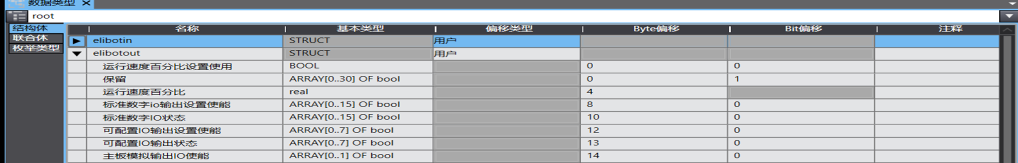 基本類型可以自己選擇,像0-31這個(gè)四個(gè)字節(jié)有用的只有運(yùn)行速度設(shè)置使能,也可以直接改成數(shù)組類型的四個(gè)byte【ARRAY[0..3]OF byte】,使用時(shí)就只需要給第一個(gè)字節(jié)的第一位設(shè)置值也可以。根據(jù)使用習(xí)慣來配置類型,像下圖中把使能設(shè)置配置成bool占1位,保留配置0-30個(gè)bool,31位是從第一個(gè)字節(jié)的第一位開始偏移,所以bit偏移是要填寫1