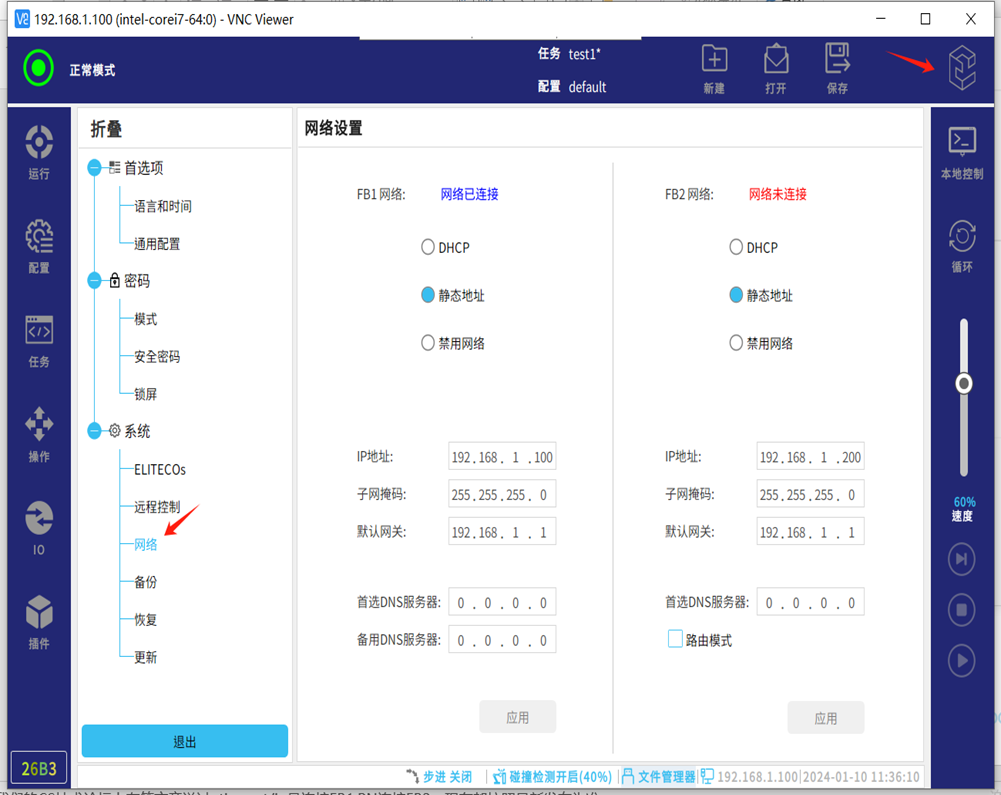 l點(diǎn)擊機(jī)器人右上角【 logo 】-【設(shè)置】-【網(wǎng)絡(luò)】設(shè)置FB1的網(wǎng)絡(luò)IP,需要與PLC同網(wǎng)段。