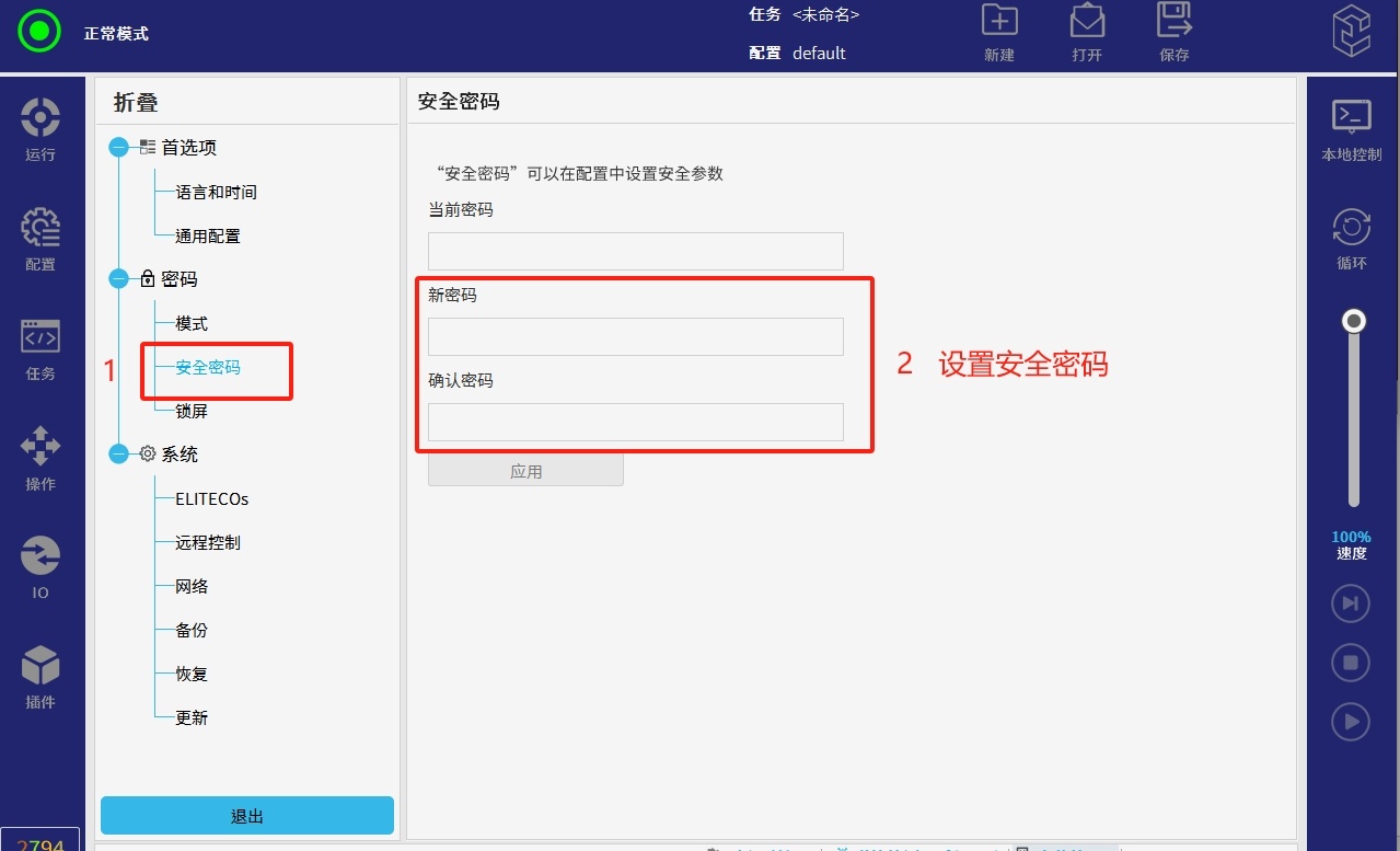 選擇“設置> 密碼> 安全密碼”,通過設置安全密碼來解鎖安全配置相關參數。設置好安全密碼后點擊應用即可。