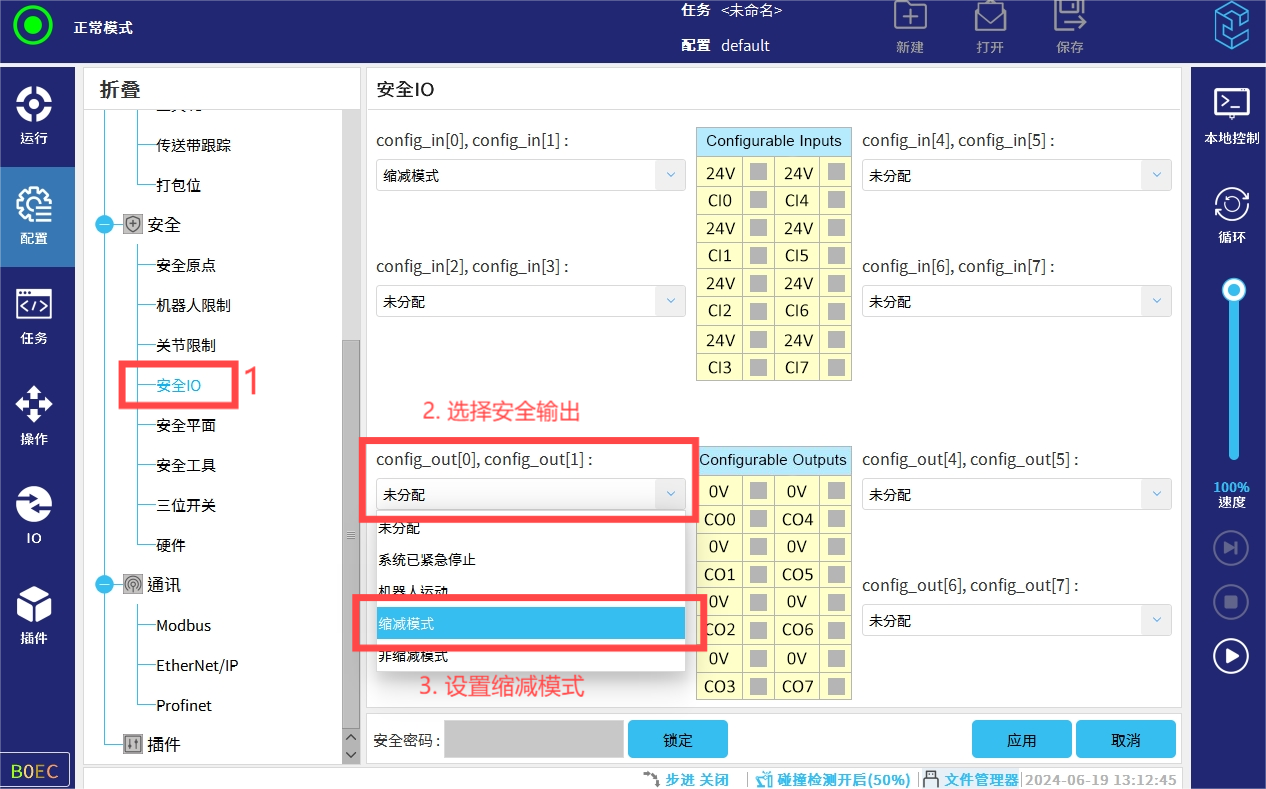縮減模式的應用場景二是在安全IO功能配置界面的安全輸入/輸出選項中,可以選擇配置縮減模式信號,以實現不同的功能。