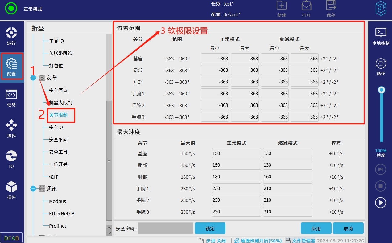 注意:在設置機器人限制參數時,正常模式下的數值要大于縮減模式下的數值。