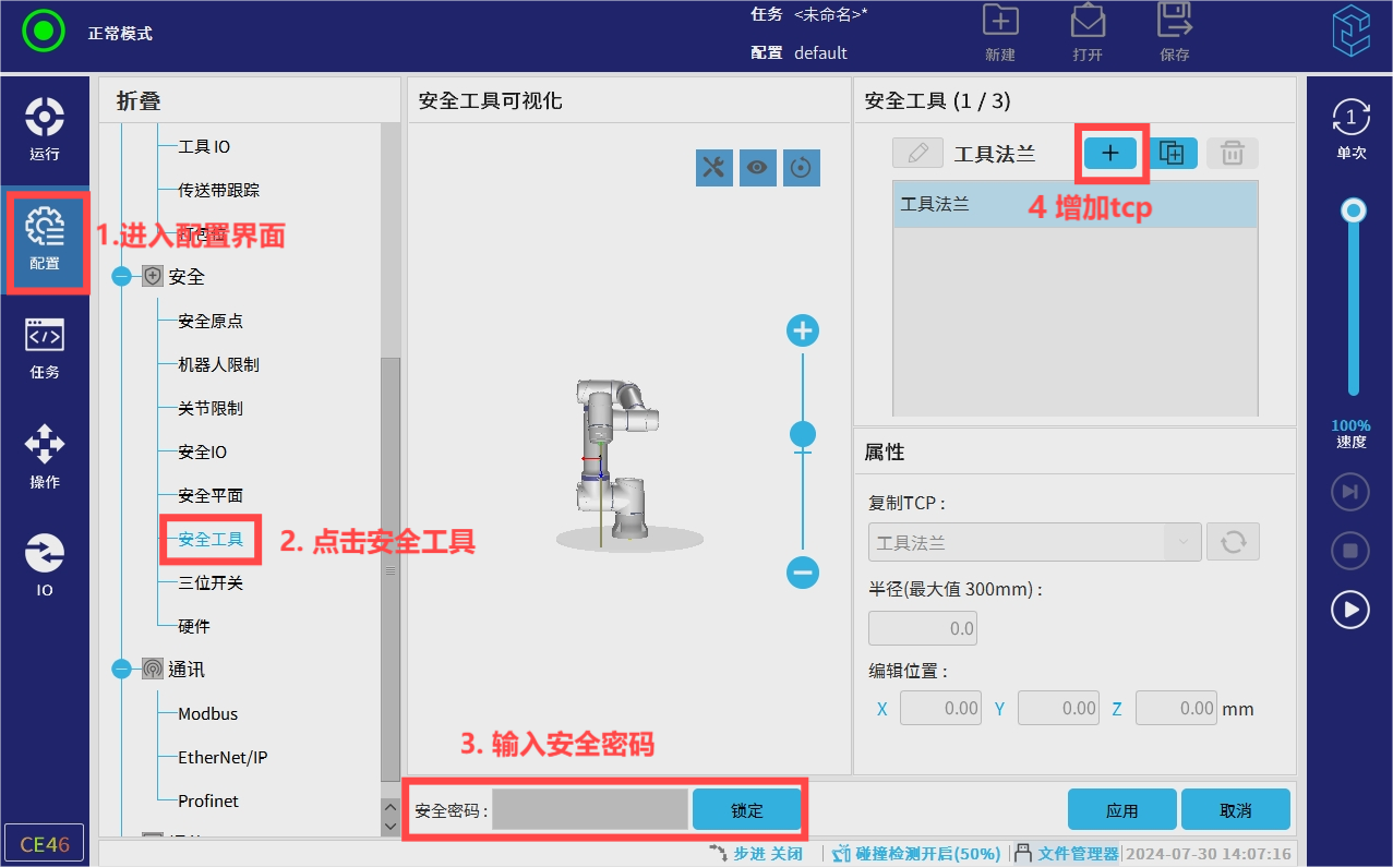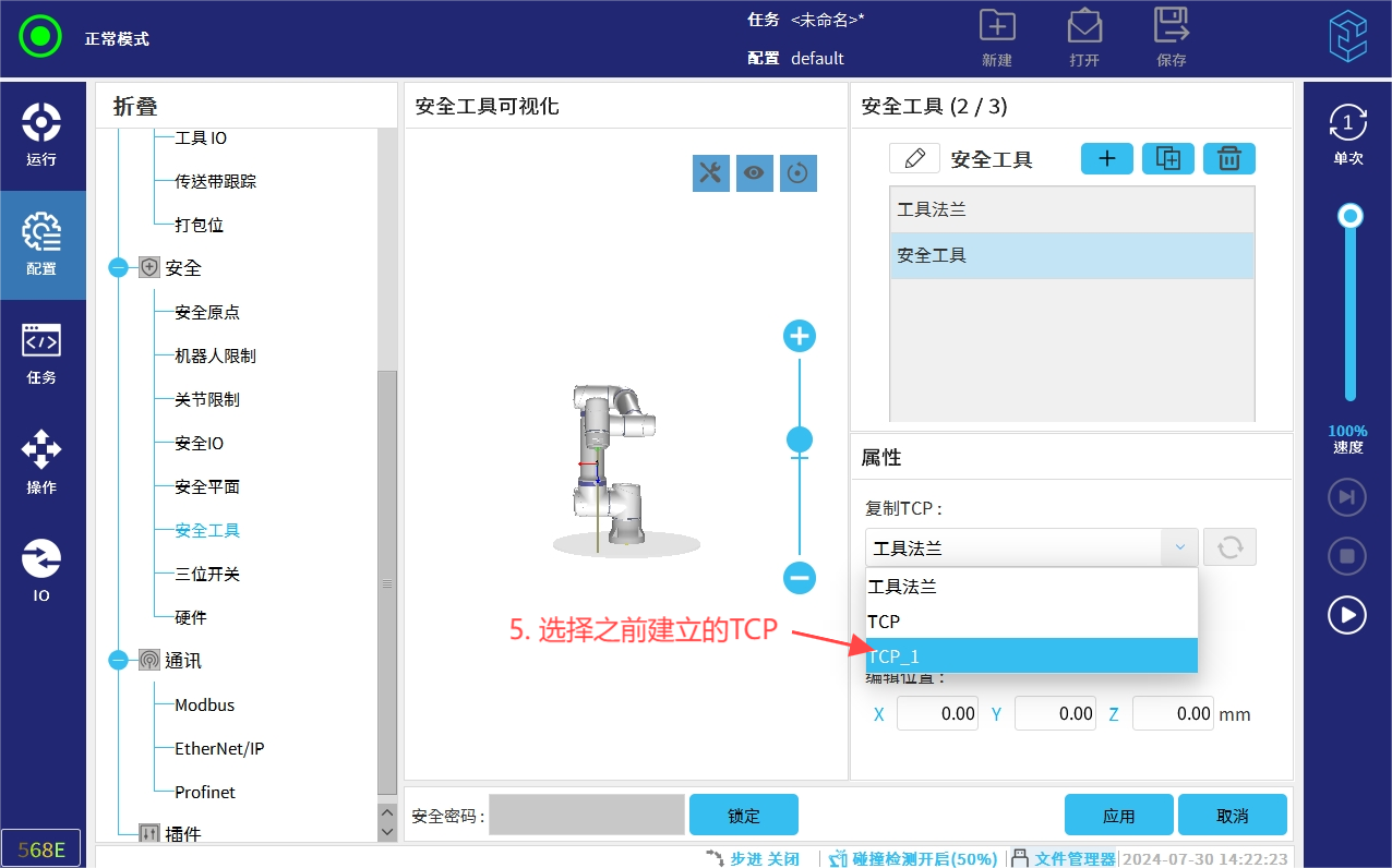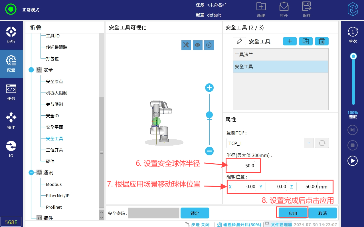 半徑的距離是0-300mm之間。設置完成安全工具后一定要點擊應用保存。點擊應用的時候機械臂會下電,是正常的。